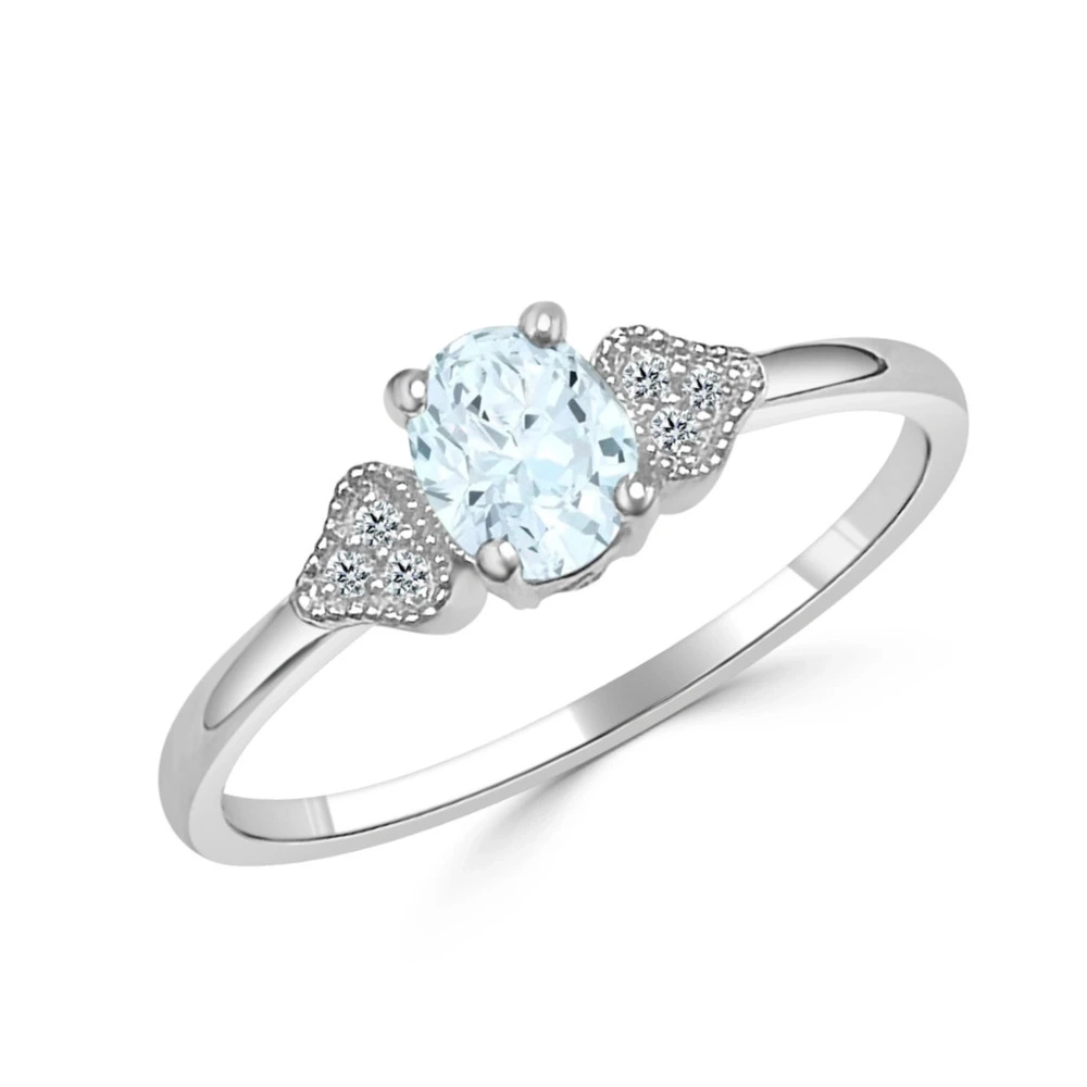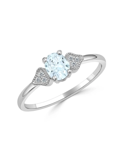 El anillo de compromiso "Sophie" con un diseño atemporal, combina la delicadeza y la elegancia de la aguamarina. Está fabricado en oro blanco de 18k y destaca con una aguamarina oval  en el centro, acompañada en sus laterales por 6 diamantes talla brillante.