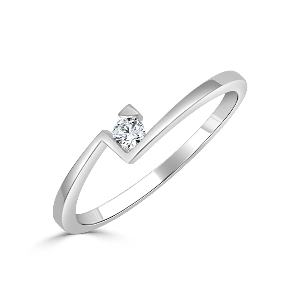 El anillo de compromiso Vivienne destaca por su silueta moderna y minimalista, donde una línea de oro blanco 18k se eleva en un elegante vértice que sostiene un diamante talla brillante de 0.065ct (H-SI). Un diseño sofisticado, diferente y lleno de personalidad.