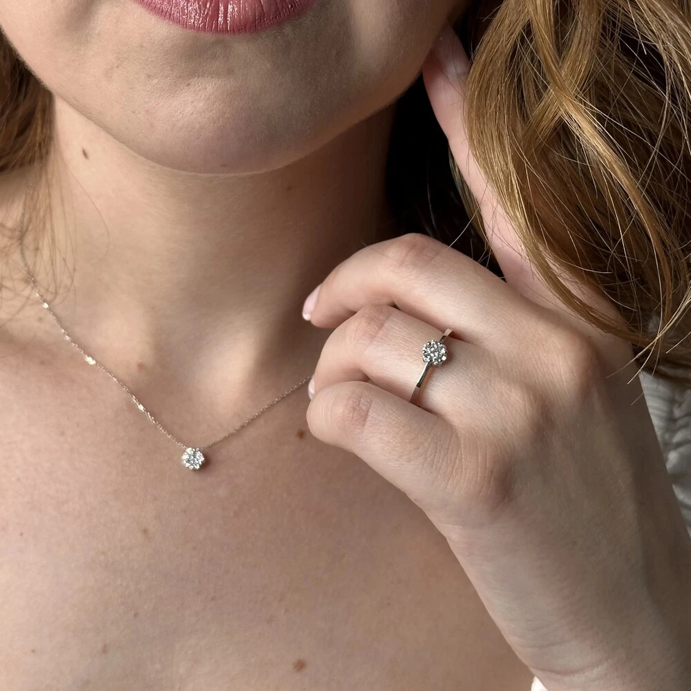 El diseño de la gargantilla de diamantes Lydie III destaca por su delicado colgante circular de 6 mm de diámetro, donde 7 diamantes naturales talla brillante se unen en una flor centelleante, creando un efecto visual de gran impacto y luminosidad.