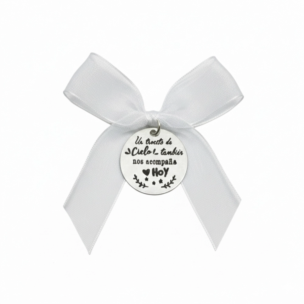 En la otra cara, podrás grabar esa frase especial que resuena contigo, ese verso, esa fecha o ese nombre que quieras llevar siempre cerca. Te ofrecemos el mismo formato de letra propuesto en nuestra imagen de referencia, con el mensaje "Un trocito de cielo también nos acompaña HOY", creando una continuidad estética y un toque de elegancia que complementa perfectamente el fotograbado. Esta frase, o la que tú elijas, añade un nivel adicional de significado a tu detalle para novia.