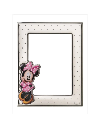 El marco presenta un elegante acabado plateado en plata bilaminada, decorado con un sutil relieve de pequeños puntos que aporta textura y sofisticación. Esta base neutra y luminosa resalta aún más la figura en color de Minnie, vestida en rosa con su icónico lazo de lunares.