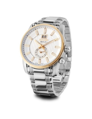 El DUWARD Diplomatic Canarias combina acero y detalles dorados en una esfera blanca texturizada que transmite elegancia y autoridad. Un reloj para novio pensado para quienes quieren destacar con clase el día de su boda.