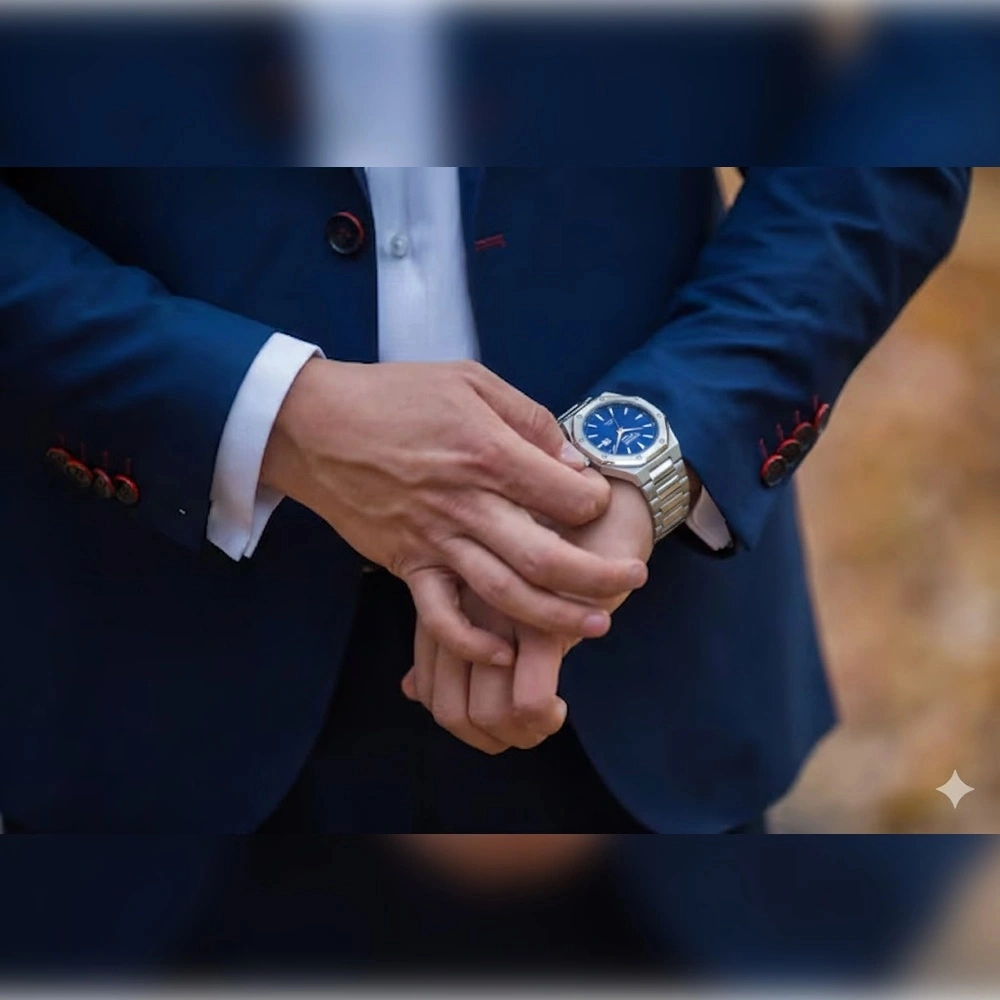 Dentro del universo de los relojes de boda, este modelo destaca por su capacidad de adaptación. Combina a la perfección con traje azul marino, gris o negro, aportando un toque actual y distinguido.